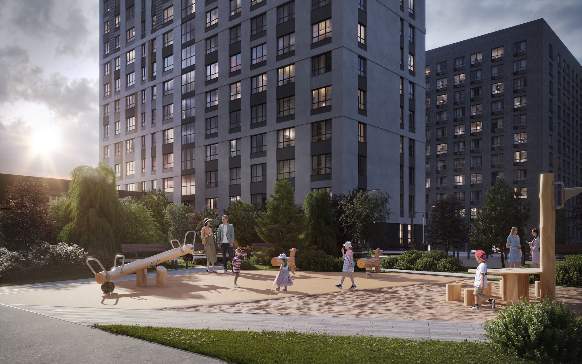 Пейзажный парк, живописный ручей, уединенные пространства с лежаками, спортивные зоны, качели и огромные песочницы.